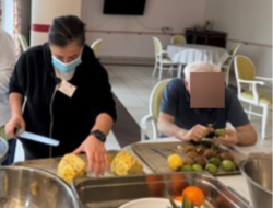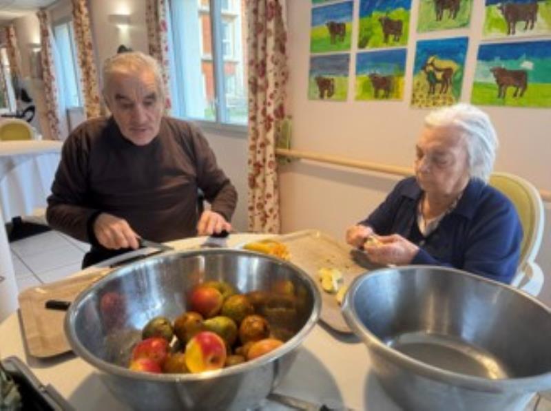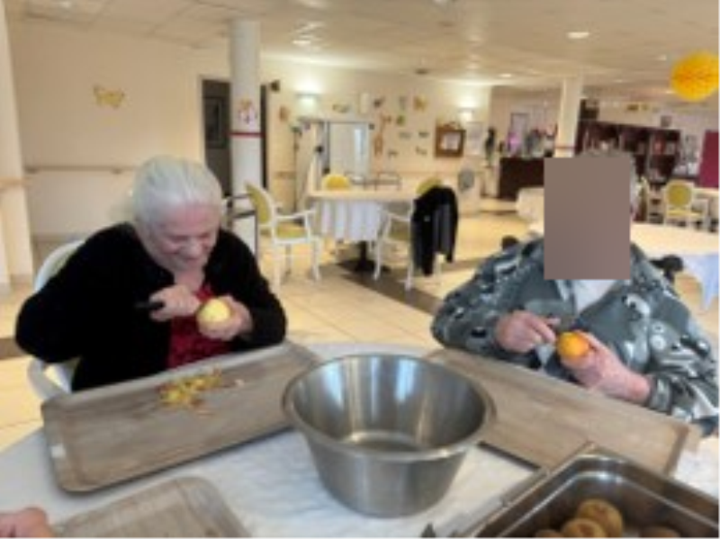Ce vendredi matin, les résidents étaient invités à préparer pour une salade de fruits (poires, pommes, ananas, kiwis bananes, oranges). Bonne ambiance autour de la table ! :)